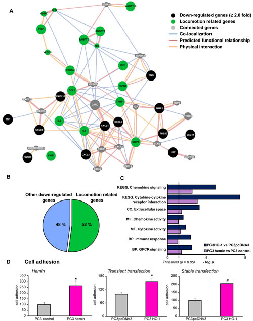 We have previously reported that PCa cells over-expressing HO-1 as well as PCa cell lines with high HO-1 endogenous levels displayed repressed levels of MMP9 [20], a metalloproteinase highly correlated with PCa invasion and metastasis [21]. Microarray analysis also revealed that HO-1 down-regulated the expression of other several pro-inflammatory and angiogenic genes. Here we used GeneMANIA [22] and DAVID database [23] to extend our query on other genes, related biological pathways and gene ontology (GO) categories [24]. Our input gene set included those genes up- or down-regulated by HO-1, either pharmacologically (hemin treatment, a potent inducer of HO-1) or genetically (PC3 cells over-expressing HO-1, PC3HO-1). The results showcased a gene network where 52% of the genes were associated with cell locomotion and motility (Fig. 1A, B). This gene network is interconnected either by reported gene co-localization, predicted functional relationship or physical interaction. Enrichment ontology analysis of the data sets from PC3 cells treated with hemin and PC3HO-1 compared to their respective controls, allows identification of gene groups associated with a particular physiologic or pathologic molecular or cellular function. We found a statistically significant and consistent association with categories including: chemokine signaling and cytokine-cytokine receptor interaction (KEGG pathways), extracellular space (GO-cellular component), chemokine and cytokine activity (GO-molecular function), immune response and GPCR (G protein coupled receptor) signaling (GO-biological process) (Fig. 1C and Supplemental Table 1). Moreover, among the network of related GO terms associated with biological process we found: migration and proliferation, locomotory behavior and chemotaxis regulation (Fig. 1C, Supplemental Table 1 & 2). We also performed an enrichment analysis using Metacore software, on the data sets corresponding to genes modulated in the PC3HO-1 versus (vs) control cell line. Results rendered a significant association of the HO-1 regulated genes with several proteins located in the extracellular space and cell membrane for the prostatic neoplasm disorder ontology (Supplemental Fig. 1). In summary, all the bioinformatics analysis showcased a strong association to the extracellular space, a compartment highly correlated with the adhesive behavior of cells.