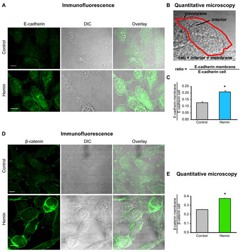 FIGURE 3: HO-1 promotes E-cadherin and β-catenin re-distribution to the cell membrane in PCa cells. A) E-cadherin expression and cellular distribution was visualized by immunofluorescence staining of PC3 cells treated with hemin (70 μM, 24 h) or vehicle (control). A representative image for each group is shown. E-cadherin localization displayed a significant increase in cell-cell border staining in cells treated with hemin compared to a more diffuse pattern observed in control cells (scale bar: 10 μm). B) Segmentation of plasma membrane (red) and cell interior was performed. Intensity of E-cadherin in the membrane region and the whole cell was measured and the ratio E-cadherin membrane/E-cadherin cell was calculated. C) Quantitative microscopy indicating the augmented levels of the E-cadherin membrane/E-cadherin cell ratio when PC3 cells were exposed to hemin (*P<0.05). D) β-catenin expression and cellular distribution visualized by immunofluorescence staining of PC3 cells treated with hemin or vehicle. A representative image for each group is shown. β-catenin localization also showed a significant increase in cell-cell border staining after hemin treatment compared to control cells (scale bar: 10 μm). E) β-catenin membrane/β-catenin cell ratio was calculated as in D (*P<0.05).
