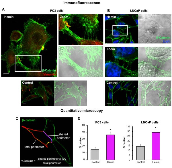 FIGURE 4: Forced-expression of HO-1 re-arranges the β-catenin-based adherens junctions in PCa cells. A) and B) β-catenin expression was visualized by immunofluorescence in LNCaP (A) or PC3 (B) cells treated with hemin (70 μM, 24 h) or vehicle (control). Representative images for each cell line are shown. β-catenin localization is observed at cell-cell adherens junctions revealing a network of filopodia from neighboring cells under hemin treatment. DAPI (blue) was used for nuclear staining and vimentin (red) for cytoplasmic staining (scale bars: 10 μm). White open boxes represent the zoomed images. C) Segmentation of the cell perimeter (red) and the shared perimeter (violet) was performed and the percentage of contact (shared perimeter x100/total perimeter) was calculated. D) Quantitative microscopy of the percentage of contact when PC3 and LNCaP cells were exposed to hemin (*P<0.05).