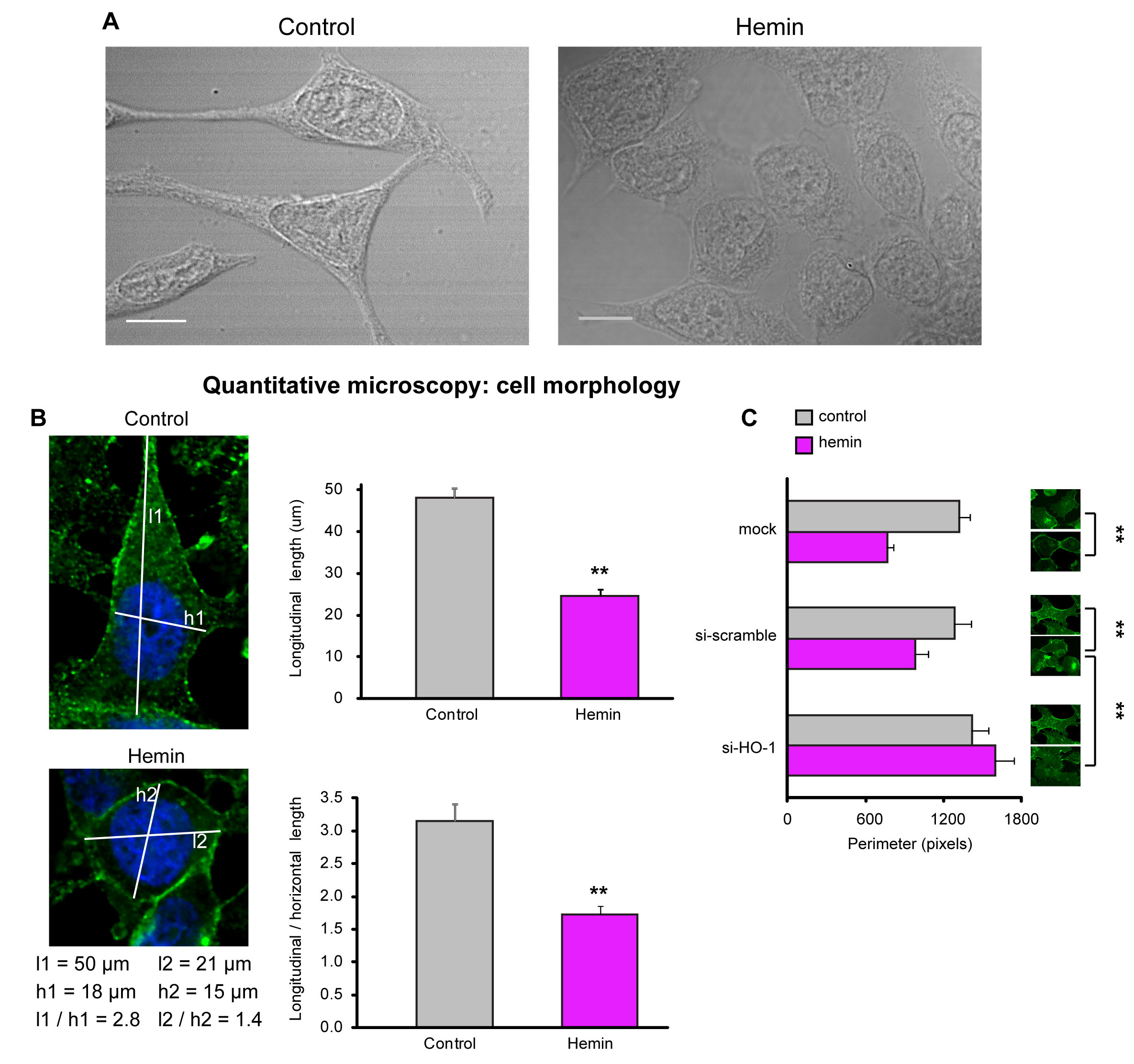 FIGURE 6: HO-1 is implicated in cell morphology regulation. A) Cell morphology was examined by bright field microscopy in PC3 cells exposed to hemin (70 μM, 24 h) or vehicle (control). B) Longitudinal lengths and longitudinal length/horizontal length ratios were measured using ImageJ software (**P<0.01; n≥13 cells for each condition). C) Cell perimeter was analyzed with Matlab in PC3 cells exposed to hemin or vehicle and transfected with siRNAHO-1 (si-HO-1) or scrambled siRNA (si-scramble) (**P<0.01; n≥10 cells for each condition).