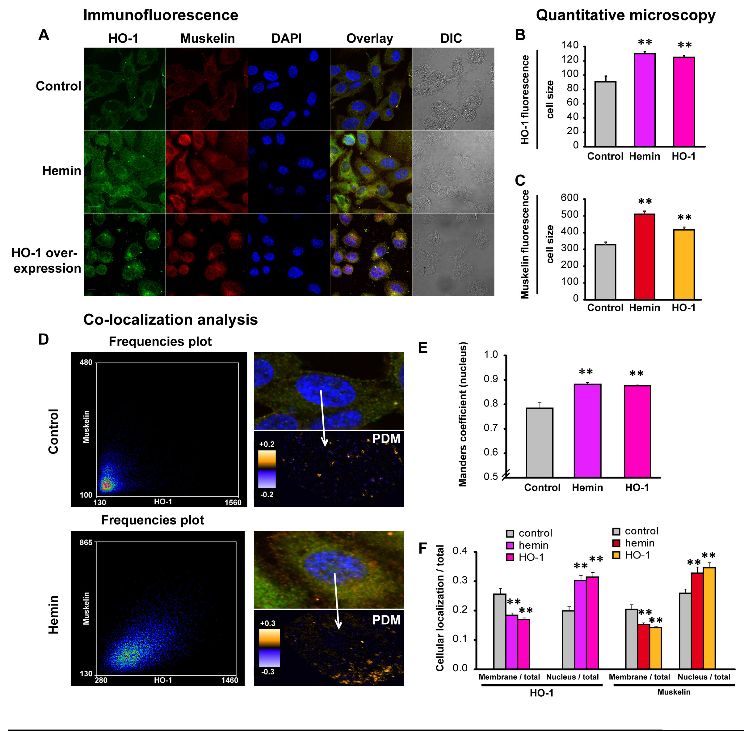 FIGURE 7: HO-1 increases muskelin expression and nuclear co-localization. A) PC3 cells treated with hemin (70μM, 24 h) or vehicle (control) and PC3 cells over-expressing HO-1 display augmented levels of Muskelin compared to controls. Cells were fixed, stained with anti-HO-1 and anti-muskelin primary antibodies and secondary antibodies conjugated with Alexa-Fluor-488 or Alexa-Fluor-555. Cells were imaged by confocal microscopy applying the same parameters for all the experimental conditions. Image processing was performed similarly in all the treatments. B-C) The florescence intensity for HO-1 (B) and Muskelin (C) was measured and normalized to the cell size using Matlab (**P<0.01; n≥15 cells for each condition). D) Representative PDM graphs and frequency scatter plots were performed with the Image J intensity correlation analysis plug-in (x-axis: HO-1-Alexa-488, y-axis: Muskelin-Alexa-555). E) Manders coefficients in the nuclei of individual cells were calculated using Matlab (**P<0.01; n≥15 cells for each condition). F) PC3 cells treated with hemin or vehicle and PC3 cells over-expressing HO-1 were assayed by immunofluorescence. HO-1 and Muskelin fluorescence were measured in the plasma membrane region and in the whole cell, and the ratios membrane/total and nucleus /total were measured for each case (**P<0.01; n≥15 cells for each condition).