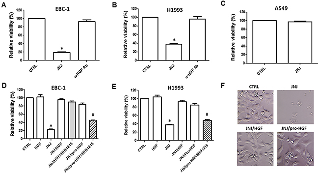 Figure 1: HGF rescues MET-amplified lung cancer cells from MET inhibition. EBC-1 (A) and H1993 (B) MET-amplified lung cancer cells, and A549 cells (C) which do not have amplified MET were treated with JNJ38877605 (JNJ) (25 nM) or HGF neutralizing antibody (α-HGF Ab). Cell viability was determined after 72 h by CellTiter Glo®. (D and E) EBC-1 and H1993 cells were treated with JNJ38877605 (25 nM), HGF (100 nM) or pro-HGF (100 nM) as indicated. Cell viability was determined by CellTiter Glo®. (F) Representative images of EBC-1 cells treated with JNJ38877605 alone or with HGF or pro-HGF after 72 h of treatment.