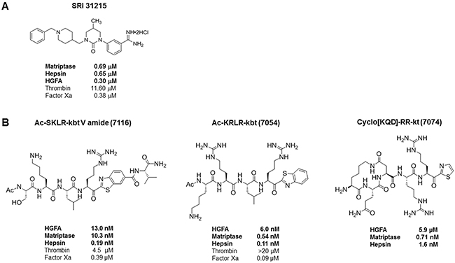 Figure 2: Molecular structure and activity of SRI31215 (A) and peptide inhibitors of pro-HGF activation, ZFH7054, ZFH7074 and ZFH7116 (B). The IC50 values for matriptase, hepsin and HGFA are indicated in bold.