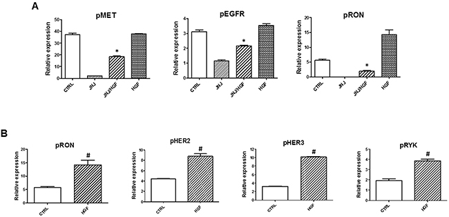 Figure 5: HGF-induced signaling in MET inhibited NSCLC cells. EBC-1 cells were treated with JNJ38877605 (25 nM) or HGF (100 nM) alone, or with a combination of JNJ38877605 and HGF for 6 hours. Cell lysates were prepared and subjected to antibody-based human phospho-receptor tyrosine kinase (RTK) array as described in methods to analyze the phosphorylation profiles of receptor tyrosine kinases. *, p < 0.05 compared to JNJ38877605 (JNJ); #, p < 0.05 compared to CTRL.