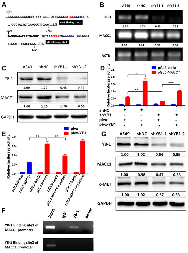 Figure 4: YB-1 promotes MACC1 transcription by binding to MACC1 promoter and activates MACC1/c-Met pathway. (A) Analysis of the MACC1 promoter indicated two putative YB-1 binding sites where the black boxes indicate sequences. RT-PCR analysis (B) and western blot analysis (C) determined the expression of YB-1 and MACC1 after inhibition of YB-1 in A549 cells. (D) MACC1 promoter (-2020 to +262) activity was analyzed by dual-luciferase reporter assay. The YB-1-silenced A549 cells and their corresponding control cells were co-transfected with plvx control plasmid or plvx-YB1 plasmid and MACC1 promoter (-2020 to +262) or basic reporter along with pRL-TK for 24h. (E) Mutated MACC1 promoter plasmids were generated (pGL3-MACC1-mutated1; pGL3-MACC1-mutated2). YB-1 binding sites in these two plasmids were mutated at two base pairs (pGL3-MACC1-mutated1: -1860 to -1856; pGL3-MACC1-mutated2: -1468 to -1464). A549 cells were transiently co-transfected with plvx vector plasmid or plvx-YB1 plasmid and the pGL3-basic reporter, the wild type MACC1 promoter reporter (pGL3-MACC1) or the mutated MACC1 promoter plasmids (pGL3-MACC1-mutated1; pGL3-MACC1-mutated2) along with pRL-TK for 24h. Transfected cells were harvested for dual-luciferase reporter assay. (F) ChIP assay was performed with YB-1 antibody or non-immune IgG as negative control. Immunoprecipitated DNA was amplified by PCR using primers as indicated. (G) Western blot analysis of YB-1, MACC1 and c-Met expression after inhibition of YB-1 in A549 cell. * P<0.05, **P<0.01,*** P<0.005.