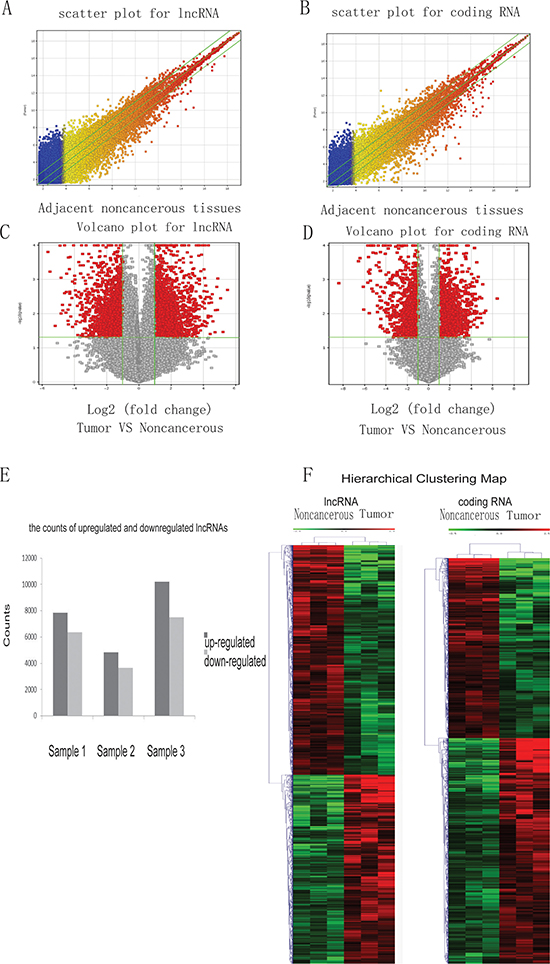 Figure 1: The expression profiles of lncRNA and coding genes in HCC and paired adjacent noncancerous samples. Total RNA from 3 pairs of HCC and noncancerous samples was isolated to study gene expression using the human lncRNA microarray v4.0. A scatter plot was used to assess lncRNA (A) and coding gene RNA (B) expression reproducibility. The values on the x and y-axis of the scatter plot are the averaged normalized signal values of noncancerous and tumor tissue (log 2 scaled). Additionally, a volcano plot was used to analyze the differentially expressed lncRNAs (C) and coding genes (D) between noncancerous and cancer tissues. The red dots to the left and to the right of the vertical green lines indicate RNAs with a greater than 2.0-fold change and statistical significance (p-value < 0.05). (E) The counts of upregulated and downregulated lncRNAs in the three samples used in the microarray. (F) Hierarchical Clustering Map of abnormal lncRNA and coding RNA in HCC.