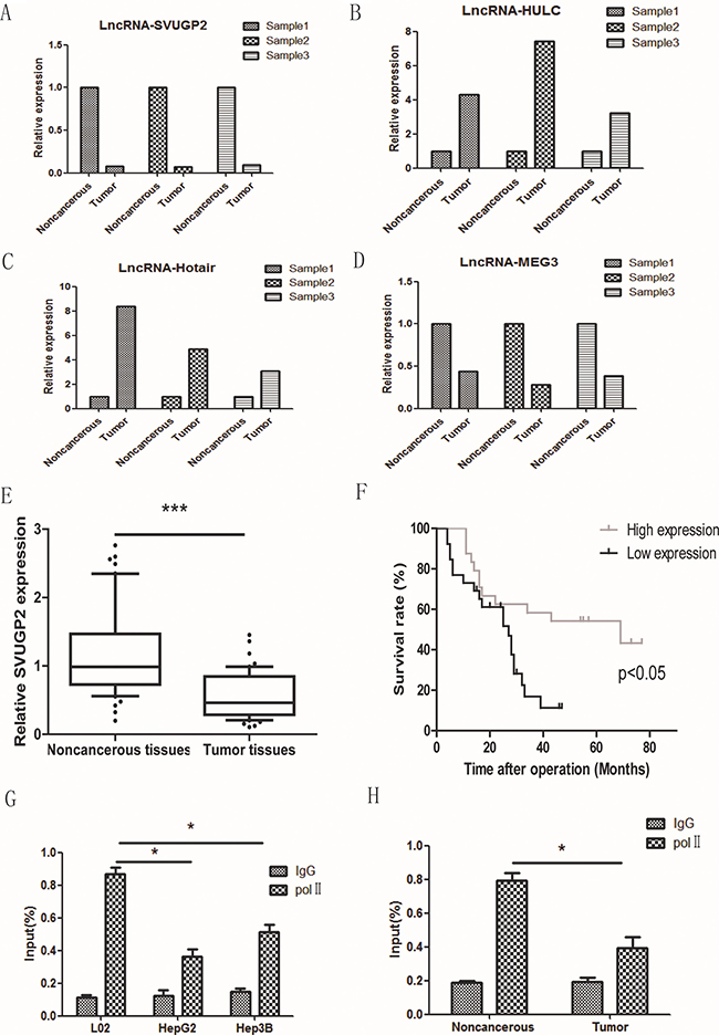 Figure 2: The level of lncRNA-SVUGP2 was decreased in HCC. RT-qPCR was performed to test the level of lncRNA-SVUGP2 (A) and some reported dysregulated lncRNAs (B–D) in three HCC samples. (E) lncRNA-SVUGP2 level was decreased in HCC tumor tissues compared with that in adjacent noncancerous tissues in 50 additional pairs of tissue samples. (F) Kaplan-Meier survival curve of 50 patients with high or low lncRNA-SVUGP2 level. Higher lncRNA-SVUGP2 level is correlated with better prognosis. (G) The result of ChIP-qPCR showing RNA Pol II occupancy on lncRNA-SVUGP2 promoter was decreased in HepG2 and Hep3B cell lines compared with that in normal hepatocyte, L02. (H) RNA Pol II occupancy on lncRNA-SVUGP2 promoter was also reduced in HCC tumor tissues compared to that in adjacent noncancerous tissues.