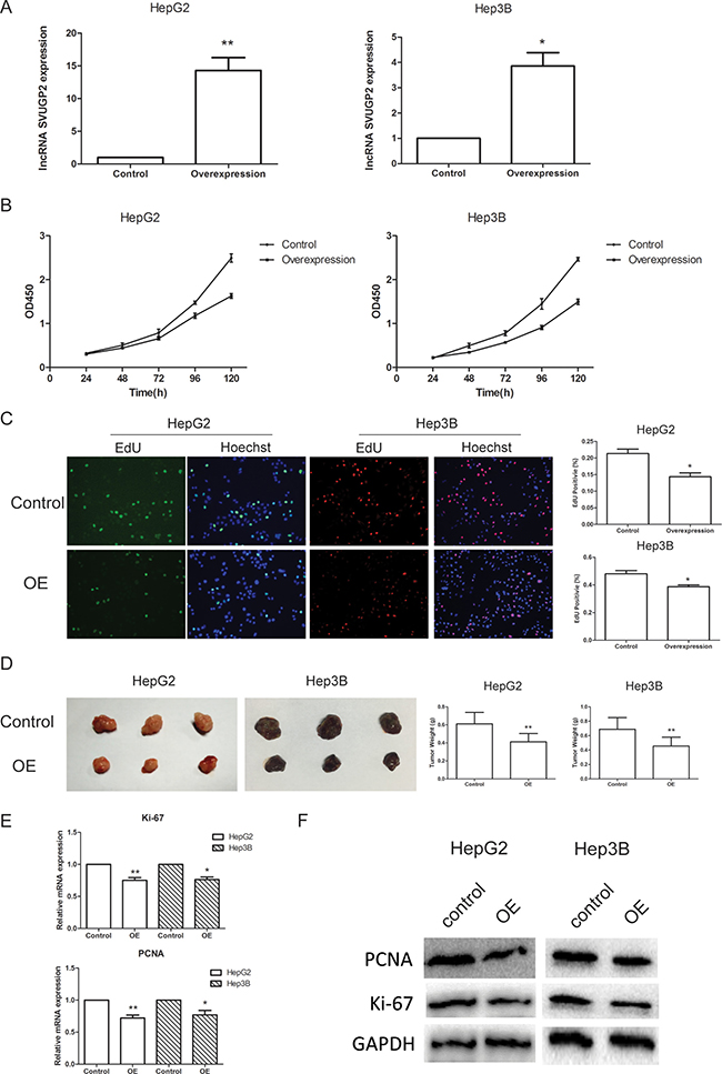 Cell lines stably overexpressing lncRNA-SVUGP2 were generated by lentivirus infection in two human liver cancer cell lines: HepG2 and Hep3B cells. Briefly, 1 × 107 HepG2 cells or 5 × 106 Hep3B cells with or without lncRNA-SVUGP2 were suspended in 200 μL of PBS, mixed with 20 μL Matrigel and injected subcutaneously into the right flank of 4- to 5-week-old nude mice. Mice were sacrificed 5 weeks after injection. For each group, tumors from 3 mice were weighed and photographed.