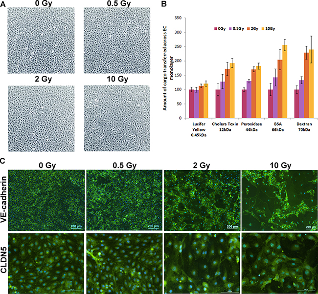 Figure 1: IR exposure increases permeability of endothelial layer through disruption of cell junctions. HCAEC were cultured for 7 days following irradiation at doses of 0.5, 2 and 10 Gy of X-ray. (A) Phase contrast microscopy pictures of irradiated HCAEC. (B) Representative results of the permeability assay. Five macromolecules of different sizes ranging from 0.45 to 70 kDa were used. The amounts transferred across the EC monolayer in an unexposed sample for each of the macromolecules (cargo) were set at 100. Error bars represent standard deviation from three technical replicates. (C) Immunofluorescence analysis of cell junctions. VE-cadherin and CLDN5 were stained with fluorescent antibodies (green), DAPI was used for staining nuclei (blue).