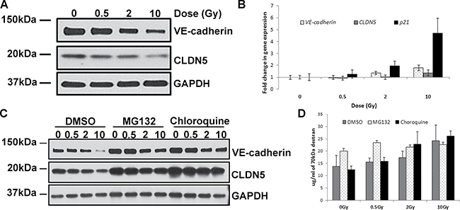 Figure 2: IR exposure decreases levels of VE-cadherin and CLDN5 proteins. HCAEC were cultured for 7 days following X-irradiation at doses of 0.5, 2 and 10 Gy. (A) Western blot analysis of VE-cadherin and CLDN5; GAPDH was used as a loading control. (B) qPCR analysis of VE-cadherin and CLDN5 gene expression. A well-characterised IR-responsive gene - p21 was used as a positive control. Gene expression results were normalised to HPRT1 endogenous control and represented as fold change in gene expression. Error bars represent standard deviation from three independent experiments. (C) Western blot analysis of VE-cadherin and CLDN5 protein level following inhibition of protein degradation. Cells were treated with proteasome inhibitor (MG132), lysosome inhibitor (chloroquine) or vector (DMSO); GAPDH was used as a loading control. (D) Representative results of the permeability assay results following inhibition of protein degradation. Cells were treated with proteasome inhibitor (MG132), lysosome inhibitor (chloroquine) or carrier (DMSO) and then subjected to permeability assay with FITC-labelled dextran 70 kDa. Error bars represent standard deviation from three technical replicates.