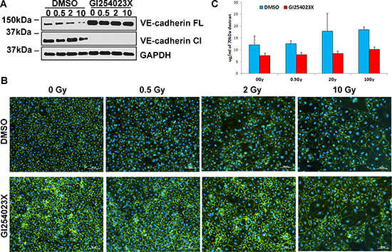 In view of the unlikely involvement of protein degradation as the means by which IR increases endothelial permeability, we turned our attention to protein modification. The 130 kDa VE-cadherin glycoprotein can be cleaved by the enzyme ADAM10, through a process called ectodomain shedding. This releases an approximately 95 kDa soluble ectodomain of VE-cadherin into the extracellular space, while leaving the 35 kDa membrane-bound fragment to be further processed by γ-secretases [28]. Since such VE-cadherin cleavage was reported to increase endothelium permeability [28, 29], we investigated, using an ADAM10-specific inhibitor GI254023X, whether ADAM10-mediated cleavage of VE-cadherin is responsible for IR-induced permeability. As would be expected, even in the absence of radiation, GI254023X blocked VE-cadherin cleavage completely, resulting in a substantial increase in the level of full-length VE-cadherin. Interestingly, this inhibitor also prevented reduction in VE-cadherin protein level after irradiation (Figure 3A), which is reflected by retention of VE cadherin at the cell junctions even after exposure to the highest radiation doses (Figure 3B). Importantly, inhibition of ADAM10 prevented the rise in permeability that would otherwise have occurred when these cells were irradiated (Figure 3C), indicating that ADAM10-mediated cleavage of VE-cadherin is responsible for increased permeability following IR exposure.