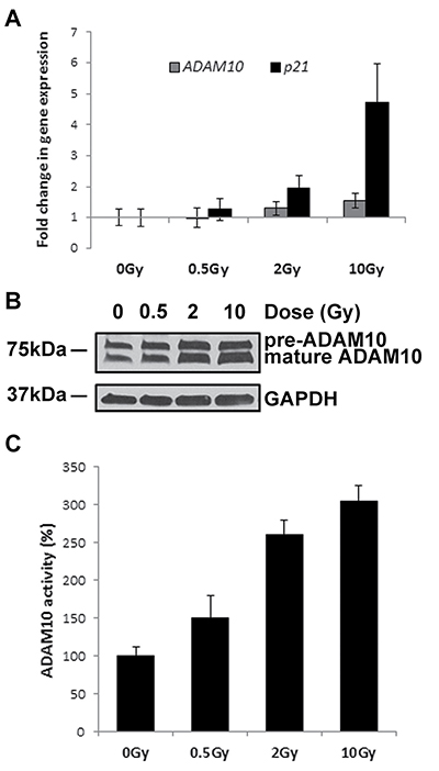 To test whether IR-exposure does indeed increase ADAM10 activity, as suggested by the experiments described above, we first tested the effect of IR on ADAM10 expression using qPCR analysis. Although we observed a radiation dose-dependent increase in ADAM10 transcript level, the magnitude of increase was very modest (Figure 4A). ADAM10 protein is synthetized as an inactive precursor of about 84 kDa which is subsequently cleaved by a furin endopeptidase or proprotein convertase 7, to produce a mature and active 68 kDa enzyme [30]. We observed that IR exposure elevated the levels of both precursor and mature ADAM10 protein (Figure 4B); however, the mature form was increased to a greater extent than the precursor, suggesting that IR induces ADAM10 maturation. Finally, as raised protein level does not necessary mean that its function is increased, we measured ADAM10 activity in live cells using ADAM10 specific substrate which fluoresces upon cleavage. We found that IR exposure significantly stimulated ADAM10 activity in a dose-dependent manner, reaching 3-fold augmentation after exposure to the highest dose, proving that IR exposure does indeed increase ADAM10 activity in HCAEC (Figure 4C).