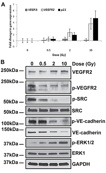 Figure 5: IR-induced permeability is independent of VEGF signalling. HCAEC were cultured for 7 days following irradiation with 0.5, 2 and 10 Gy of X-ray. (A) qPCR analysis of VEGFA and VEGFR2 gene expression. A well-characterised IR-responsive gene - p21 was used as a positive control. Gene expression results were normalised to HPRT1 endogenous control and represented as fold change in gene expression. Error bars represent standard deviation from three independent experiments. (B) Western blot analysis of proteins involved in VEGFA signalling; GAPDH was used as a loading control.