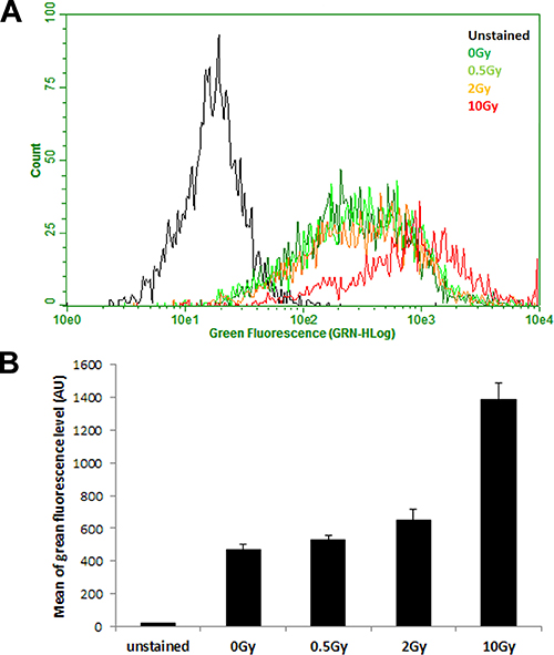 Figure 6: IR exposure increases intracellular calcium concentration. HCAEC were cultured for 7 days following irradiation with 0.5, 2 and 10 Gy of X-ray, and then loaded with intracellular calcium indicator Fluo-4, AM. (A) Histogram of green fluorescence representing intracellular calcium level analysed by flow cytometry. (B) Arithmetic mean of green fluorescence in each sample. Error bars represent standard deviation from three technical replicates measured in duplicates.