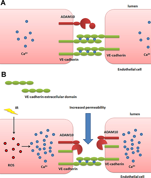 To summarise, we have identified ADAM10-mediated shedding of VE-cadherin as an underlying cause of IR-induced endothelium permeability. We have shown that IR exposure stimulates ADAM10 activity probably by increasing intracellular calcium concentration in a dose-dependent manner and blocking ADAM10 with specific inhibitor is sufficient to restore endothelium barrier following exposure.