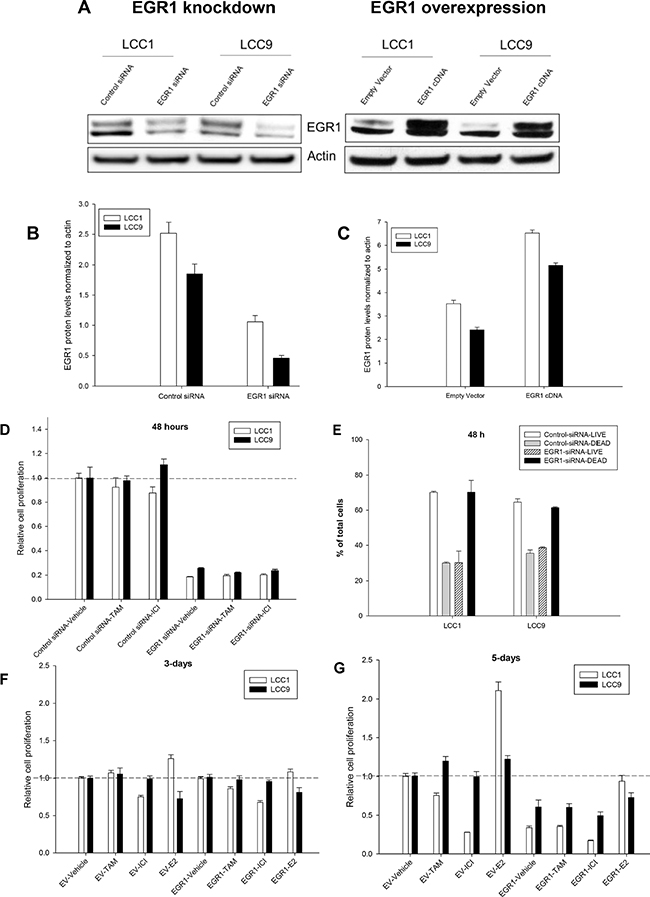 EGR1 is an immediate-early gene induced by estrogen, growth factors, or stress signals, and can exhibit both tumor suppressor and promoter activities. A nuclear phospho-protein and transcription factor that can promote cell proliferation and cell death [7, 8], EGR1 can be induced by external stimuli, with its induction being either transient or sustained. Such a diverse array of functions is achieved through differential regulation of EGR1 expression and its selection of target genes [7]. A highly conserved DNA-binding domain on EGR1 targets the GC-rich consensus sequence GCG (G/T) GGGCG. Transcriptional activity of EGR1 is further regulated by NAB-1 and NAB-2 (NGF-I A-binding proteins) [9, 10]. EGR1 can promote growth of some hormone regulated cancers including prostate cancer [11]. EGR1 mediated signaling is important for the normal development of female reproductive organs [12] but its precise role in breast cancer remains unclear. The EGR1 gene is deleted in some ER-negative breast tumors [13]. In ER+ breast cancer cells, EGR1 is induced by estrogen treatment following raf-1 kinase activation [14] and is inhibited with acquired resistance to ICI [15]. EGR1 has been associated with sensing cellular glucose levels [16, 17], in fatty acid metabolism and inflammation [18] in various cells. In this study, we investigated the role of EGR1 in endocrine resistance to validate an integrated model consisting of differentially expressed genes and metabolites in endocrine resistant breast cancer cells. Decreased levels of EGR1 in ER+ breast cancer cells and human tumors correlated with decreased sensitivity to antiestrogens. However, sustained inhibition of EGR1 with siRNA or tolfenamic acid (TOLE) suppressed the growth of endocrine resistant breast cancer cells and interacted synergistically with both 4-hydroxytamoxifen (hereafter referred to as TAM), major active metabolite of tamoxifen, and ICI in inhibiting cell proliferation. EGR1 inhibition also disrupted fatty acid metabolism in endocrine resistant cells. Overall, our gene-metabolite integrated model suggests a novel role for EGR1 in regulating cellular metabolism in endocrine resistant breast cancer.