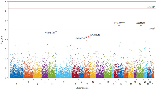 Two (rs75992542, rs56350726) of the top five SNPs associated with mPCa are located on chromosome 9, while the other three, rs2241714, rs143790069 and rs7282158, are located on chromosomes 19, 15 and 6, respectively. Three of the SNPs, rs2241714, rs7282158 and rs56350726, are intronic variants and the other two, rs143790069, rs75992542, encode missense changes within exons. The genes in which each of the SNPs are located are as follows; rs2241714, B9D2 and TMEM91; rs143790069, THBS1; rs7282158, TMEM14B; rs75992542, RABGAP1; and rs56350726, LOC105376116 and SLC28A3, respectively. rs2241714 is located in the promotor of the TGFB1 gene and it is associated with lung cancer [7]. rs143790069, rs72821581 and rs75992542 has not been kwon the function of these SNPs.