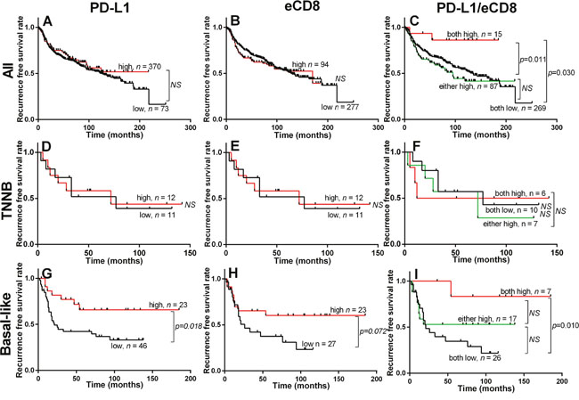 To validate these findings, we conducted in-silico analysis of microarray gene expression data using an online survival analysis tool to assess the prognostic effect of PD-L1 in another cohort [26]. Supplementary Figure 1 shows that PD-L1 was prognostic for RFS but not OS within this overall cohort (RFS: p < 0.001, OS: p = ns). Within the Basal-like subset, PD-L1 was prognostic for both RFS and OS (RFS: p = 0.0001; OS: p = 0.011).