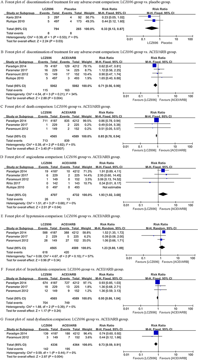 The main findings were as follows: (1) individuals assigned LCZ696 showed a statistically decreased risk of death compared with those assigned ACEI/ARB; (2) treatment with LCZ696 significantly decreased the risk of serious adverse events, discontinuation of treatment for any adverse event, renal dysfunction and bronchitis compared with a placebo or ACEI/ARB treatment; (3) LCZ696 significantly increased the risk of angioedema and dizziness; (4) for any adverse event, hypotension, hyperkalemia, cough, upper respiratory tract inflammation, diarrhoea, back pain, nasopharyngitis, headache and influenza, there was no significant difference between groups.
