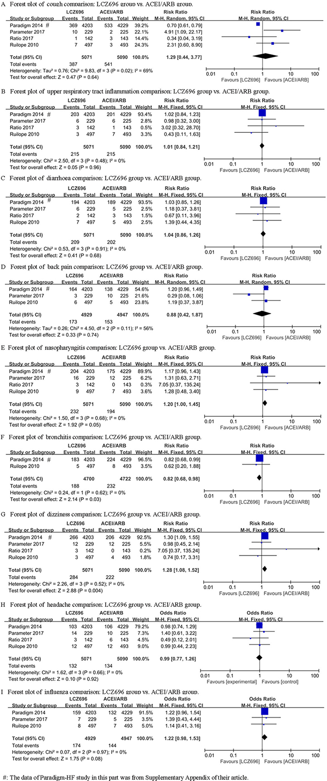 The PARAMOUNT study didn’t explicitly provide the data involving other adverse effects, while the other 4 studies (Ruilope’s study, PARADIGM-HF study, Ratio study and Parameter Study) mentioned the adverse effects of cough, dizziness, upper respiratory tract inflammation, diarrhoea, bronchitis, back pain, nasopharyngitis, headache and influenza. For cough and back pain, random effect model were used (I2 = 69% and I2 = 56%) and the results showed no difference between the LCZ696 group and the ACEI/ARB group [RR = 1.29, 95% CI (0.44, 3.77), Z = 0.47, P = 0.64; RR = 0.88, 95% CI (0.42, 1.87), Z = 0.33, P = 0.74] (Figure 3A and 3D). For upper respiratory tract inflammation, diarrhoea, nasopharyngitis, headache and influenza, fixed effect model was used and the results also showed no difference between the LCZ696 group and the ACEI/ARB group [respectively: RR = 1.01, 95% CI (0.84, 1.21), Z = 0.05, P = 0.96; RR = 1.04, 95% CI (0.86, 1.26), Z = 0.41, P = 0.68; RR = 1.20, 95% CI (1.00, 1.45), Z = 1.92, P = 0.05; RR = 0.99, 95% CI (0.77, 1.26), Z = 0.10, P = 0.92; RR = 1.22, 95% CI (0.98, 1.53), Z =1.75, P = 0.08] (Figure 3B, 3C, 3E, 3H, 3I). LCZ696 significantly decreased the occurrence risk of bronchitis compared with ACEI/ARB [fixed effect model, respectively: RR = 0.82, 95% CI (0.68, 0.98), Z = 2.14, P = 0.03] (Figure 3F). However, LCZ696 significantly increased the occurrence risk of dizziness compared with ACEI/ARB [RR = 1.28, 95% CI (1.08, 1.52), Z = 2.88, P = 0.004] (Figure 3G).