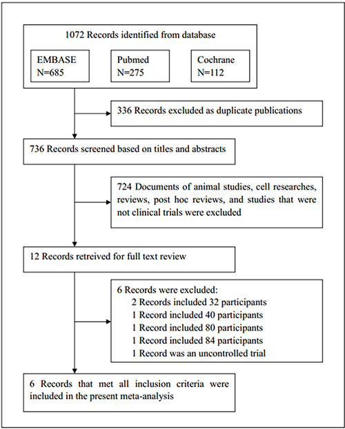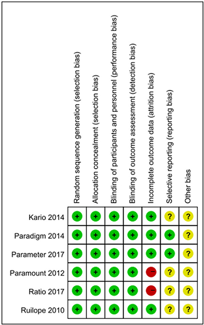 EMBASE, PubMed and the Cochrane Library of Trials were carefully searched from April 2010 to May 2017 for the study. The following search terms or key words were used alone or in combination: ‘sacubitril/valsartan’, ‘LCZ696’, ‘neprilysin inhibitor’, ‘AHU377’, ‘valsartan’, ‘enalaprilat’, ‘hypertension’ and ‘heart failure’. After initially identifying 1072 potential trials, 336 duplicate documents were identified and 724 documents that were not clinical trials were excluded. The remaining 12 trials were carefully evaluated and 6 trials were excluded because there were less than 100 participants or they were non-controlled trials. Finally, a total of 6 eligible RCTs with 11,821 patients were included (Figure 4). All the 6 articles were published in English, conducted on human subjects, and classified as RCTs (Table 1). All of the 6 studies were at a lower risk of bias. These studies were conducted according to published protocols and randomization, double blinding, controlling, intention-to treat (ITT) were all performed for all of these studies. Risk of bias analysis was shown in Figures 5 and 6.