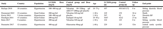 There are a number of limitations to our meta-analysis. First, in order to minimize the heterogeneity and bias, we used strict selection criteria, and thus only 6 randomized controlled trials of LCZ696 met the inclusion criteria. Furthermore, although the number of participants included in the study reached 11,821, most of them were from the PARDIGM-HF study. In addition, except for PARDIGM-HF study (27 months) and Parameter study (52 weeks), the other studies were generally short, so the results on the adverse effects only reflected the short-term effects of LCZ696. Therefore, we are anticipating the new larger trials of LCZ696, such as the PARAGON study and the UKHARP study, which will provide more useful information for us.