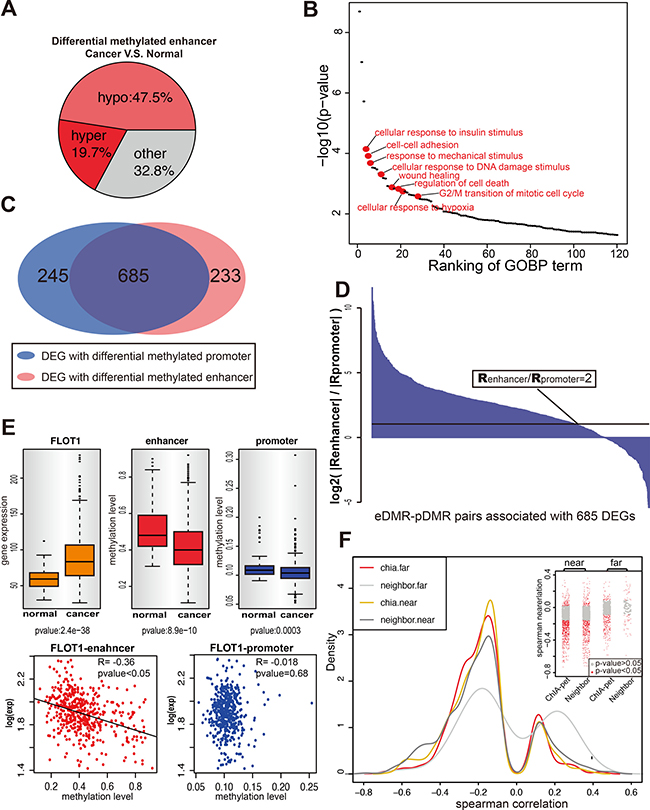 Figure 1: Identification of eDMRs and the target genes in breast cancer. (A) The differentially methylated enhancers (t-test p value < 0.05) in malignant breast tissues are shown as three categories: hypermethylated, hypomethylated and others. (B) Gene ontology result shows eDMR target DEGs are enriched with cancer related genes. Each dot represents one GOBP term (p < 0.05), and the red ones are cancer-related. (C) Most of DEGs in 2429 E-P pairs are differential methylation for both enhancer and promoter when compare breast tumor to breast normal samples (TCGA). Venn diagram shows the number of DEGs for each part. (D) For the DEGs with both enhancer and promoter differential methylation, the enhancer methylation status takes the leading role of gene expression regulating. The ratio of Spearman correlation between enhancer methylation and gene expression to the Spearman correlation between promoter methylation and gene expression is indicated by the height of each bar. Each bar represents one enhancer-promoter pair. More than one pairs were counted when genes interact with multiple enhancers. The black line is the cutoff of ratio equals 2. (E) An example to show rather than promoter, enhancer methylation correlates with gene expression. The upper panel shows the expression of gene FLOT1 and the methylation of its enhancer and promoter in normal and cancer samples. The lower panel shows the correlation between gene expression and methylation of enhancer and promoter. (F) ChIA-PET is advanced in identifying remote enhancer-target pairs. Figure shows the distribution of Spearman correlation of E-P pairs identified by ChIA-PET (Red, > 100kb; Yellow, < 100kb) and E-P pairs whose promoters lied near by enhancers (Light Gray, > 100kb; Dark Gray < 100kb). The insert panel within the figure shows the Spearman correlation for each pair of each group. Every dot represents one E-P pair, and the gray region has p-value > 0.05.