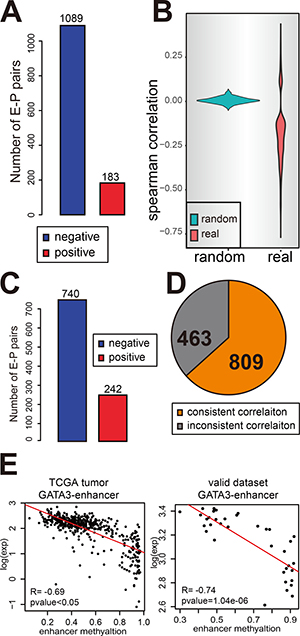 Figure 2: Enhancer methylation negatively correlates with gene expression. (A and C) The number of negative correlated E-P pairs (blue) and positive correlated pairs (red) in TCGA breast cancer samples (A) and normal tissue samples (C). (B) The correlation between enhancer methylation and gene expression is not a random event. Figure shows the Spearman correlation for E-P pairs (p-value < 0.05) identified by ChIA-PET (red) and also random control pairs identified by randomly selected genes as target for each enhancer (green). (D) The result for enhancer methylation regulating gene expression can be repeated in validate dataset. The pie chart shows the portion of consistent result. (E) An example to show the consistent correlation in validating dataset and TCGA tumor samples.
