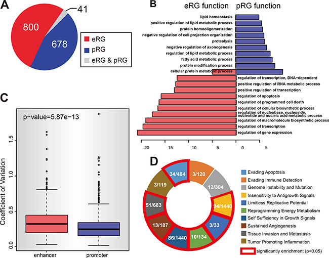 Figure 4: The divergent pattern of enhancer and promoter methylation in repressing gene expression. (A) The methylation of enhancer and promoter regulate different type of genes. The pie chart shows the numbers of eRGs (enhancer regulated genes) and pRGs (promoter regulated genes). Gray part represents the genes that are both eRG and pRG. (B) eRGs and pRGs are different in function. Figure shows the gene ontology analysis result for eRGs and pRGs. Only the top 10 GO terms are shown for each type. (C) Enhancer methylation is more variable than promoter ones. Figure shows the coefficient of variation for all enhancers and promoters that are covered by 450k array. (D) eRGs are enriched in cancer hallmarks. Figure shows the enrichement result of eRGs for each cancer hallmark. In each box, shows the number of eRGs in hallmark (left) and the total number of genes in hallmark (right). Red line indicates significant enrichment (p-value < 0.05).