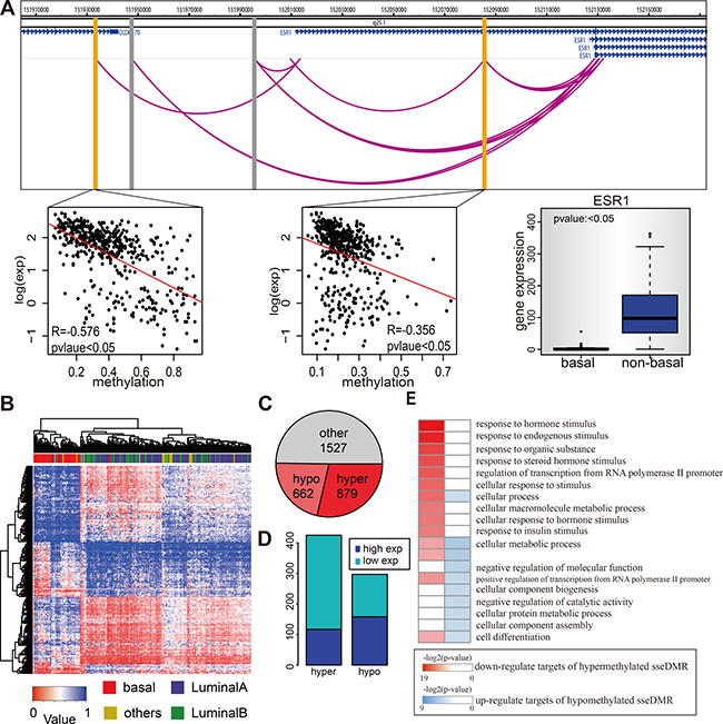 ESR1 gene is the coding gene of Estrogen Receptor (ER) and shows differential expression among the cancer samples, with basal-like samples the negative expression and non-basal-like the positive expression (Figure 5A), consistent with its role in distinguishing the ER-negative versus ER-positive breast cancer subtypes. Among the 1272 E-P pairs, there are four candidate enhancers, and 2 of them may directly regulate ESR1 expression, supported by significant negative correlation (Spearman p-value < 0.05) between the enhancer methylation and ESR1 expression. For example, the one located ~70kb upstream of ESR1 TSS has a Spearman correlation of −0.58 (p = 1.8e-44) (Figure 5A). Similarly, some other eRGs such as FOXA1 and ERBB2 (Supplementary Figure 5A), were also found to be differentially expressed in basal vs. non-basal breast cancer samples probably owing to the differential enhancer methylation. To explore the possibility that the enhancer methylation may be able to distinguish different breast cancer subtypes, we compared the enhancer methylation profile of basal subtype with that of non-basal subtypes and identified 1541 subtype specific enhancers (sseDMR) with differential methylation from 3067 enhancers. Importantly, clustering analysis of the enhancers identified two groups of cancer samples which matched exactly the cancer subtypes as the basal subtype and non-basal subtypes (Figure 5B). In total, 879 enhancers out of 1541 sseDMRs are hypermethylated in basal subtype, slightly more than that of 662 in non-basal subtypes (Figure 5C). Next, because we have assigned the target genes to each enhancer with PolII ChIA-PET data, the E-P pairs whose enhancers are sseDMRs can be separated into hypermethylated and hypomethylated groups according to the enhancer methylation status in basal vs. non-basal breast cancer subtypes. As expected, the hypermethylated enhancers in basal subtypes tend to have low expressed targets ( t-test p-value < 0.05 Basal V.S non-basal ), while the number of high expressed targets of hypomethylated enhancers is only slightly more than low expressed ones. (Figure 5D). To further investigate the functional significance of enhancer methylation in different breast cancer subtypes, the differentially expressed genes were used for gene ontology analysis. Interestingly, the low expressed target genes of the hypermethylated enhancers in basal subtype associated with the functions such as “response to hormones,” “response to endogenous stimulus” and response to chemicals” etc. (Figure 5E), which consistent with the features of the basal subtype of breast cancer. However, the functions enriched by all the low expressed genes in basal subtype without considering their enhancer methylation status were quite different from enhancer methylation-driven ones (Supplementary Figure 5B–5C). This observation suggests an enhancer methylation specific role in driving basal subtype associated genes dysregulation.