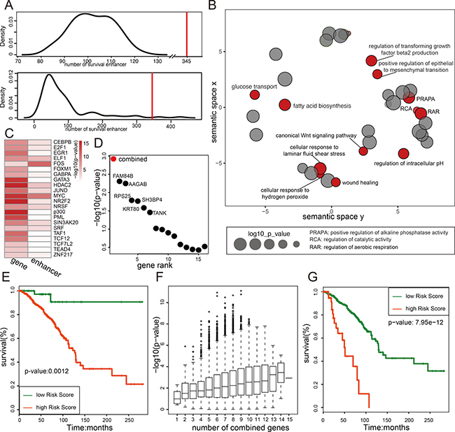 Figure 6: Enhancer methylation status predicts breast cancer risk. (A) The number of survival related enhancer is larger than random. Figure shows two random analysis results, the upper panel is the number distribution of random regions whose methylation level related with patient overall survival (log-rank p-value < 0.05). The random region used here is selected as described in method; the lower panel is the number distribution of enhancers whose methylation level related with overall survival for perturbed patients. The red line is the number of survival enhancer in real data. (B) Genes regulated by methylation of survival enhancer are functional related with cancer. Go analysis result of these genes are shown in figure. The size of the node represents the enrichment p-value (shown in log), and red dots indicate the function associated with cancer. (C) The transcriptional factors enrichment result for promoters and enhancers of 120 targets of survival enhancer. (D) The combination of 15 breast cancer risk genes shows more effective on predicting patient overall survival. The log-ranked p-values of 15 breast cancer risks genes (black) and the combined p-values of all 15 genes (red) are shown in figure. (E) The overall survival curve for the combination of all 15 breast cancer risk genes. (F) The diversity of combination of 15 risk genes and the effect of them on prognosis. Figure shows all the log-rank p-value of combined survival analysis. The x-axis indicates the number of genes combined together in survival analysis. (G) The survival curve for the most significant combination model in survival analysis (The combination of gene CCDC83, PPFIBP2, KRT80, GADD45A, TANK, CCDC57, SLC34A1, RPS25 and TACC2).
