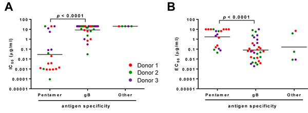 Figure 1: Functional attributes of the HCMV antibodies based on their antigen specificity. The mAbs were grouped based on their antigen specificity for neutralizing potency (panel A.) and relative binding affinity to HCMV (panel B.) IC50 or virus-specific EC50 of antibodies are defined as the concentration of the IgG required to block 50% viral entry in ARPE-19 cells or to achieve 50% of the maximal binding signals in virus-specific ELISA. Antibodies from different donors are indicated by different colors. Nineteen mAbs reacted to recombinant “pentamer” and thirty-two to “gB.” The “other” represents mAbs not reactive to either gB or pentameric complex in ELISA. The lines represent the geometric means for the group. Unpaired two-tailed t-test was performed. Differences with statistical significance are shown with p values. The data are representative of two independent experiments.