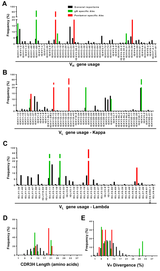 Figure 3: Repertoire distributions of antibodies in donor 1. Heavy- (VH) and light-chain (Vκ and Vλ) repertoires were obtained from deep sequencing of libraries with 5’-RACE PCR amplification. The processed antibody (n = 23) chain sequences of NGS data (black), gB specific (green), and pentamer specific sequences (red) of isolated mAbs were used to calculate heavy- (panels A, D, E) and light-chain (panel B, C) repertoire properties such as germline gene usage for heavy-chain (panel A), κ chain B., and λ chain C., complementarity determining region 3 length for heavy chain (CDR3H) D., and VH germline gene divergence E.