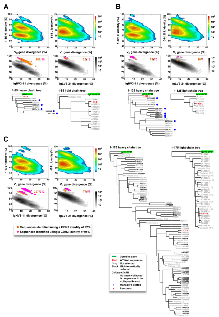 Figure 4: Lineage and correlation analysis of three pentamer-specific antibodies from donor 1. For mAbs 1-85 (panel A), 1-125 B., and 1-175 C., an identity/divergence plot, CDR3-based lineage analysis, and phylogenetic analysis are combined to provide insights into lineage maturation and structure in the context of the repertoire (color coded) and the specific germline gene family that gives rise to the antibody (black contour lines). In the identity/divergence 2D analysis, sequences are plotted as a function of sequence identity to the template mAb and sequence divergence from putative germline genes. Color coding denotes sequence density. The maximum-likelihood tree of selected somatic variants with a CDR3 identity of 95% or greater to the template antibody is rooted by the putative germline gene and shown for both heavy and light chains.