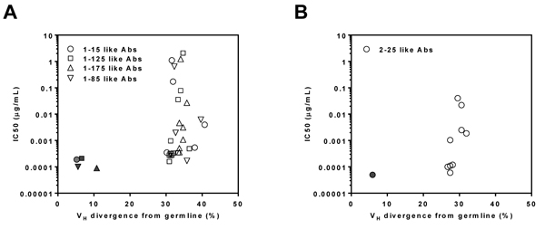 Figure 5: Antiviral function of reconstituted somatic variant antibodies. mAbs 1-15 like (circle, n = 6), 1-125 like (square, n = 13), 1-175 like (regular triangle, n = 8) and 1-85 like (inverted triangle, n = 6) antibodies of donor 1 A. and 2-25 like antibody (circle, n = 10) of donor 2 B. were paired with their respective parental reference antibody light-chains and expressed as reconstituted antibodies. The reconstituted antibodies were then tested for neutralizing activity in ARPE-19 cells. For each reconstituted antibody, based on their lineage group, a plot is used to assess correlation between their IC50 (y-axis) and VH divergence from germline (x-axis) of antibodies. Solid symbols refer to the correlation of the parental reference antibodies. The data are representative of two independent experiments.