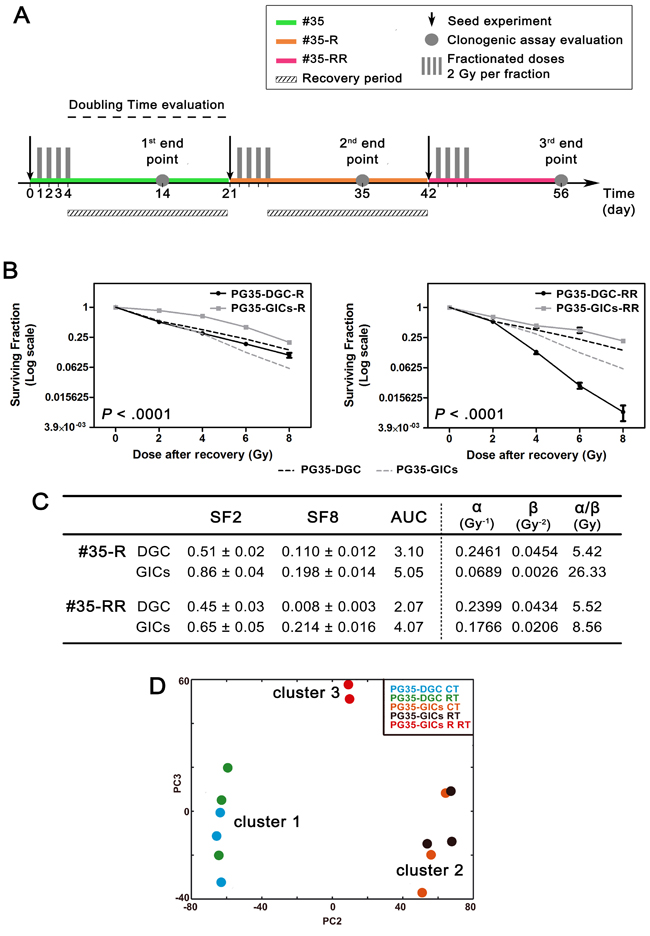 Figure 3: Generation of a radioresistant clone. A. Schedule of the repeated cycles of fractioned RT carried out on #35 culture pair. B. Clonogenic assay survival curves after second (left) and third (right) radiation cycles. Data are plotted in Log(2) scale. Black and grey dashed lines represent PG35-DGC and PG35-GICs survival curves respectively and were included as internal reference (n = 4, two-way ANOVA calculated comparing PG35-DGC-R to PG35-GICs-R and PG35-DGC-RR to PG35-GICs-RR). C. Survival curves and LQM parameters. D. Genome-wide transcriptomic analysis of microarray data using unsupervised PCA plot. CT, control; RT, 8 Gy irradiated.