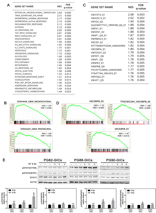 Figure 4: Transcriptomic analysis of radioresistant PG35-GICs-R. A. List of GSEA Hallmark gene sets significantly enriched in cluster_3 compared to cluster_2 ranked according to NES. GSEA significance level: FDR < 0.05. NES, normalized enrichment score; FDR, false discovery rate. B. GSEA enrichment plot of Mes and PN Verhaak signatures [23]. C. Top twenty TF gene sets significantly activated in cluster_3 compared to cluster_2 ranked according to NES (FDR < 0.05). D. GSEA enrichment plot of C/EBPβ-associated gene sets. Individual NES and FDR were reported. E. Analysis of STAT3 phosphorylation following RT. Representative western blot and pSTAT3(Y705) and pSTAT3(S727) bands quantitation (n = 3, *P < 0.05; **P < 0.01, unpaired t-test).