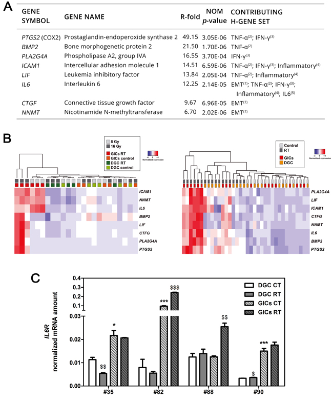 Figure 5: PMT and inflammation are preferentially activated in GICs following RT and correlate with patient outcomes. A. Panel of genes selected to validate microarray data ranked according to R-fold (FDR < 0.05). B. Unsupervised hierarchical clustering of panel expression following fractionated RT and control condition. Data from #35 (left) and #82, #88, #90 (right) are depicted. C. IL6Rα expression in primary cultures (n = 3, *P < 0.05; ***P < 0.001, unpaired t-test comparing data to DGC CT; $$P < 0.01; $$$P < 0.001, unpaired t-test comparing data to corresponding control).
