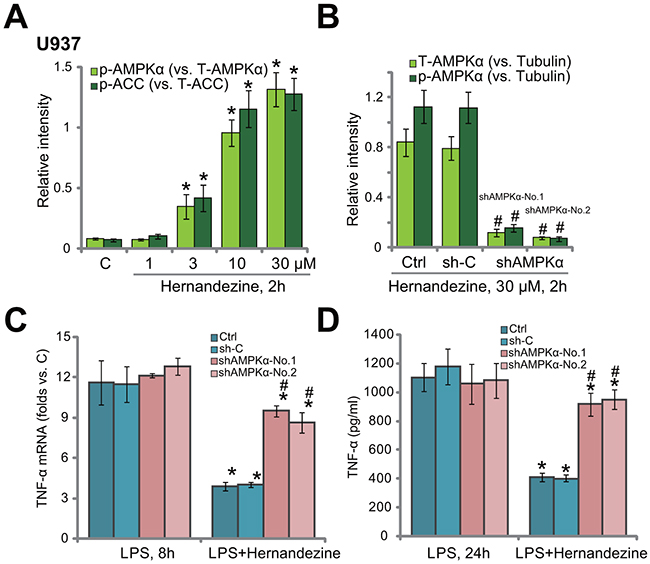 Figure 3: Activation of AMPK is required for hernandezine-induced anti-LPS response. U937 cells were treated with hernandezine (1-30 μM) for 2 hours, expression of listed proteins was tested by Western blotting assay, and blot data of three sets of repeat were quantified (A) U937 cells were infected with lentiviral AMPKα shRNA (“shAMPKα-No.1”/“shAMPKα-No.2”) or scramble control shRNA (“sh-C”), and stable cells were established; cells were treated with hernandezine (30 μM) for 2 hours, expression of listed proteins was tested by Western blotting assay (blot data of three sets of repeat were quantified (B)); cells were also treated with LPS (100 ng/mL), TNFα mRNA expression (C) and protein content (in conditional medium, (D)) were tested. “Ctrl” stands for un-infected cells. *p<0.05 vs. “C” (A). # p<0.05 vs. “sh-C” group (B). *p<0.05 vs. LPS only group (C and D). # p<0.05 vs. hernandezine of “sh-C” group (C and D). Experiments in this figure were repeated three times, and similar results were obtained.