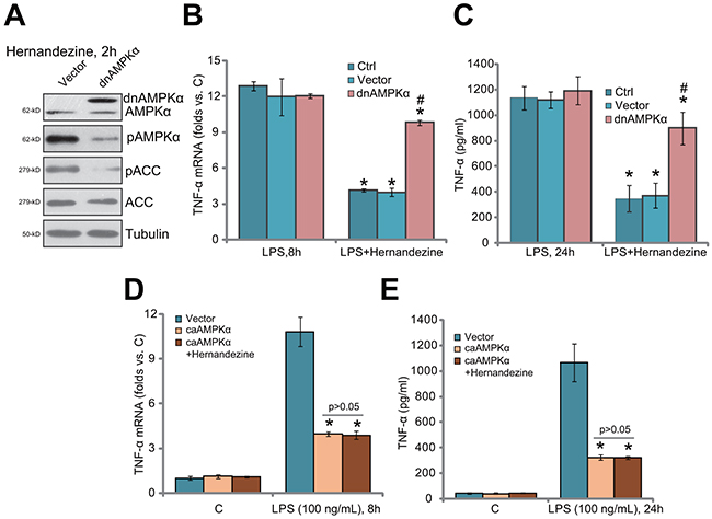 Figure 4: AMPKα dominant negative mutation abolishes hernandezine-induced anti-LPS response. U937 cells were constructed with the dominant negative mutant AMPKα (T172A, “dnAMPKα”), the constitutively activate AMPKα (T172D, “caAMPKα”) or the empty vector (pSuper-puro, “Vec”), and stable cells were established; Cells were treated with hernandezine (30 μM) or plus LPS (100 ng/mL) for indicated time, expression of listed proteins was tested by Western blotting assay (A); TNFα mRNA expression (B and D) and protein content (in conditional medium, (C and E) were tested by qRT-PCR assay and ELISA assay, respectively. *p<0.05 vs. LPS only group. # p<0.05 vs. hernandezine of “Vec” group. Experiments in this figure were repeated three times, and similar results were obtained.
