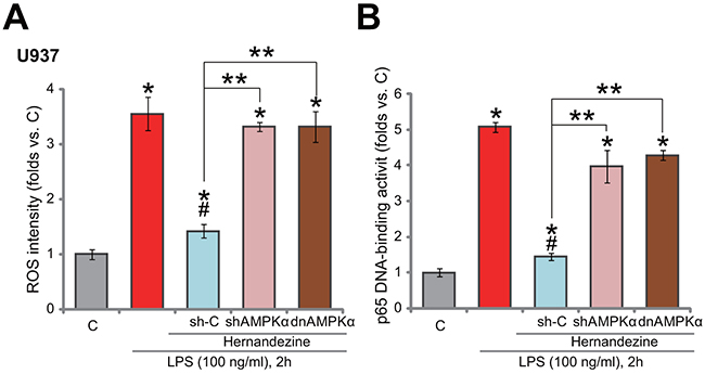 Figure 5: Hernandezine inhibits LPS-induced ROS production and NF-kB activation. Stable U937 cells, with scramble control shRNA (“sh-C”), AMPKα shRNA (“shAMPKα”, No.1) or dominant negative AMPKα (T172A, “dnAMPKα”), were treated with LPS (100 ng/mL) or plus hernandezine (30 μM) for indicated time, relative ROS intensity (A) and NFκB activation (B) were tested. * p < 0.05 vs. “C” group.# p < 0.05 vs. LPS only group. ** p < 0.05. Experiments in this figure were repeated three times, and similar results were obtained.