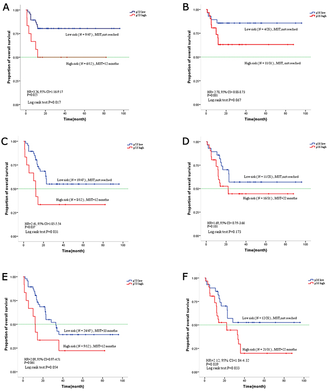 Patients with high p53 expression had unfavorable one-year (HR, 3.26, 95%CI, 1.16-9.17, p=0.025), two-year (HR, 2.41, 95%CI, 1.05-5.54, p=0.037) and three-year (HR, 2.09, 95%CI, 0.97-4.51, p = 0.061) survival rates (Figure 2). Patients at high risk showed shorter mean survival times (12 months) in contrast to patients at low risk with longer mean survival times (33 months).Patients with a low expression of p16, had better three-year survival compared to patients with high p16 expression (HR, 2.12, 95%CI, 1.04-4.32, P=0.039) (Figure 2). The mean survival time of patients with low p16 expression was over 36 months compared to 22 months for patients with high p16 expression. Accordingly, patients with high p16 showed a trend toward poor one-year survival rates (HR, 2.78, 95%CI, 0.88-8.73, p=0.081) and two-year (HR, 1.69, 95%CI, 0.79-3.66, p=0.181).