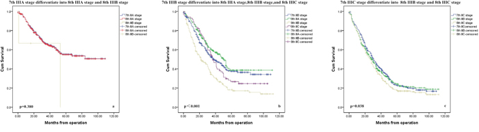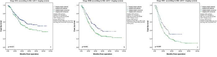 Figure 2a-2c presents the overall survival curves of the patients according to the classification in the 7th and 8th edition of the AJCC staging system. IIIA stage did not show statistical differences because too few patients changed to new stage in the 8th edition (Figure 2a, p=0.380). However, the survival curves for staging shift patients versus staging stable patients of stage IIIB/IIIC subgroups according to the classification in the 7th edition AJCC system were significantly different (Figure 2b-2c, p<0.05). Significant differences between survival curves of the staging shift and staging stable patients were also observed in 8th AJCC classifications (Figure 3a-3c, p<0.05).