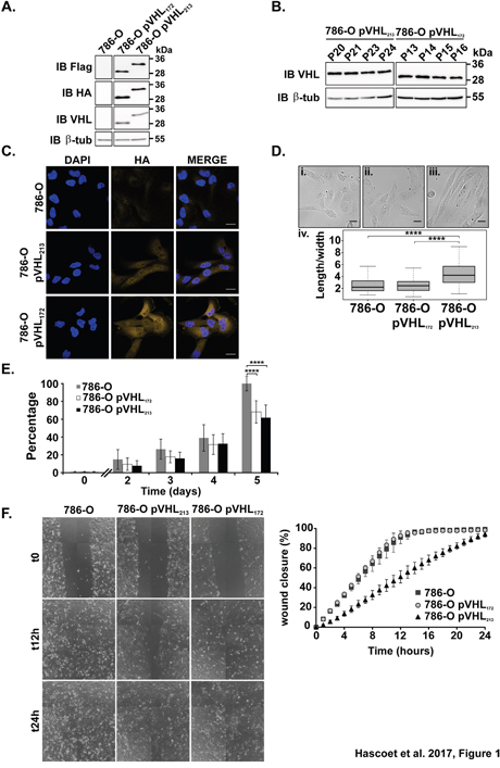 Figure 1: Analysis of the phenotypes of the cells expressing pVHL172 or pVHL213. (A) pVHL expression in 786-O, 786-O-pVHL172 and 786-O-pVHL213 cells assessed by immunoblotting with the indicated antibodies. (B) pVHL expression at different passages in the stable 786-O-pVHL172 and 786-O-pVHL213 cell lines assessed by immunoblotting. (C) pVHL expression analyzed by immunocytochemistry with an anti-HA antibody in 786-O (upper panels), 786-O-pVHL213 (middle panels) and 786-O-pVHL172 cells (lower panels). Nuclei were stained with DAPI (scale bar: 25μm). (D) The length and width of 786-O cells (i), 786-O-pVHL172 (ii) and 786-O-pVHL213 (iii) cells were measured and the length/width ratio (iv) was calculated (n=100/each, ****: p<0.0001, Mann-Withney test). Scale bar: 25μm. (E) Proliferation of 786-O, 786-O-pVHL172 and 786-O-pVHL213 cells was assessed using the PrestoBlue™ assay. Values were normalized to the mean 786-O cell number at day 5 (mean±s.d. of three independent experiments with eight independent samples; ****: p<0.0001, Mann-Withney test performed at day 5). (F) Analysis of cell migration by wound healing assay. Results were expressed as the percentage of wound closure at the indicated time points (mean±s.d. of three independent samples representative of three independent experiments).