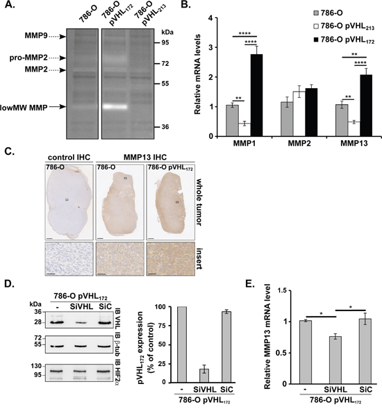 Figure 3: pVHL172 promotes MMP13 upregulation. (A) Zymography assay performed using gelatin-containing gels and 786-O, 786-O-pVHL172 and 786-O-pVHL213 protein extracts. Arrows indicate the digestion areas corresponding to the different pro-MMPs or MMPs, according to their molecular weights. Low MW MMP: low molecular weight MMPs (possibly MMP1, -3, -8, -13, or -23). (B) RT-qPCR assays using reverse-transcribed RNAs extracted from 786-O, 786-O-pVHL213 and 786-O-pVHL172 cells were performed to monitor the expression of MMP1, MMP2 and MMP13. (C) MMP13 expression analyzed by immunohistochemistry in whole 786-O and 786-O-pVHL172 cell-derived tumors (upper panels; scale bar: 1 mm). A 40X magnification is shown in the lower panels (scale bar: 50 μm). Control: secondary antibody alone (left panels). (D) Efficiency of siRNA-mediated pVHL172 downregulation assessed by immunoblotting with anti-pVHL172 and -β-tubulin (control) antibodies in 786-O-pVHL172 cells harvested 72 hours after transfection with siRNAs against VHL RNA variant 2 (SiVHL), control siRNA (SiC) or transfection reagent alone (-). The histogram shows the quantification of the results (mean ±SEM; n=4); pVHL172 expression in control cells (-) was set to 100. (E) RT-qPCR analysis of MMP13 expression in 786-O-pVHL172 cells transfected with SiVHL, SiC or transfection reagent alone (-). RNA levels were normalized to GAPDH and RPLPO and the expression level in control 786-O-pVHL172 cells (-) was set to 1. (n=4). *: p<0.05; **: p<0.01; ***: p<0.001; ****: p<0.0001, Mann-Whitney test.