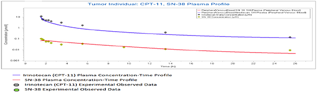 Figure 2: Population simulation result in PK-Sim. Predicted plasma profile of CPT-11 and SN-38 in an individual with tumor.