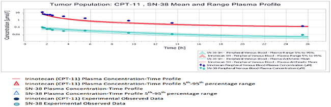 Figure 3: Mean and 5th-95th percentile plasma profile of CPT-11 and SN-38 in the tumor population.