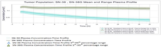 Figure 4: Mean and 5th-95th Percentile Plasma Profile of SN-38 and SN-38 G in the tumor population.