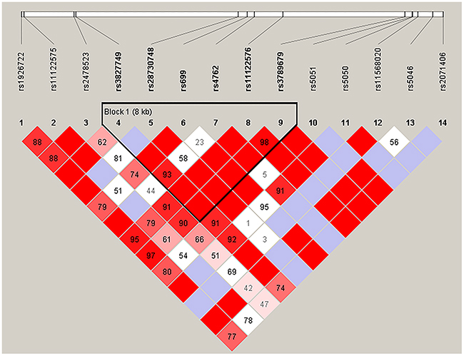 Table 1 shows the basic information of cases and controls groups. The basic information of candidate SNPs in Han and Tibetan subjects were summarized in Table 2 and Table 3. The location information of candidate SNPs in the case and control groups were presented in Table 4. In Han populations, we found that the rs2291804 (OR = 0.137, 95% CI = 0.035-0.536, p = 0.001), rs2291805 (OR = 0.293, 95% CI = 0.129-0.665, p = 0.002), rs3768294 (OR = 0.291, 95% CI = 0.131-0.647, p = 0.002), rs3754334 (OR = 0.402, 95% CI = 0.192-0.840, p = 0.014), rs6603856 (OR = 0.321, 95% CI = 0.140-0.737, p = 0.006), rs6669624 (OR = 0.359, 95% CI = 0.150-0.856, p = 0.017), rs11260742 (OR = 0.344, 95% CI = 0.155-0.761, p = 0.007), rs13375644 (OR = 0.296, 95% CI = 0.123-0.713, p = 0.005) and rs10907223 (OR = 0.354, 95% CI = 0.152-0.821, p = 0.013) in EPHA2 were significantly associated with decreased HAPC risk. Furthermore, the rs699 (OR = 0.446, 95% CI = 0.222-0.897, p = 0.022), rs4762 (OR = 0.253, 95% CI = 0.091-0.701, p = 0.005) and rs5051 (OR = 0.413, 95% CI = 0.207-0.826, p = 0.011) in AGT gene were associated with decreased HAPC susceptibility. Similarly, in Tibetan populations, the rs2478523 (OR = 2.629, 95% CI = 1.005-6.876, p = 0.043) in AGT were associated with increased HAPC susceptibility.