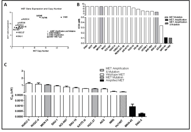 Figure 1: MET amplified gastric cancer cells undergo growth arrest when exposed to MET inhibitor crizotinib. (A) MET RNA expression levels were compared to MET copy numbers for a panel of thirteen gastric cancer cell lines using data generated by the CCLE. (B) Inhibitory concentration 50% (IC50) values of crizotinib in a panel of nineteen gastric cancer cell lines were compared using data generated by the CCLE. (C) Independently determined IC50 values of crizotinib in a panel of thirteen human gastric cancer cell lines. Cells were exposed to increasing concentrations of crizotinib for 5 days and viable cells were assessed using the MTT colorimetric assay. Data are means ± SEM from three independent experiments.